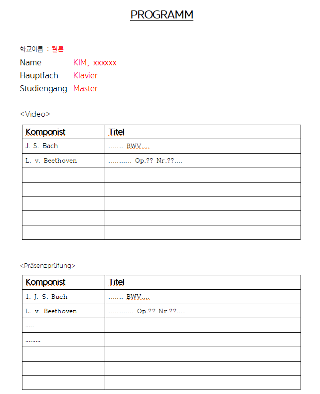 모든 곡명 및 작곡가는 영어 또는 독일어 등의 통상적으로 사용되어지는 곡명을 사용하여 작성해주시면 되고 Op, No. 등의 번호까지 확실히 써주시길 바랍니다.