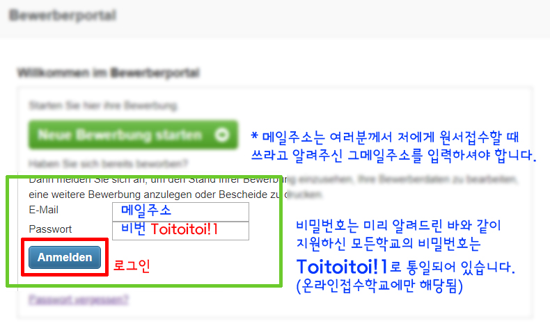 다 입력하셨으면 왼쪽편에 있는 파란색 박스의 anmelden을 누르시면 됩니다.