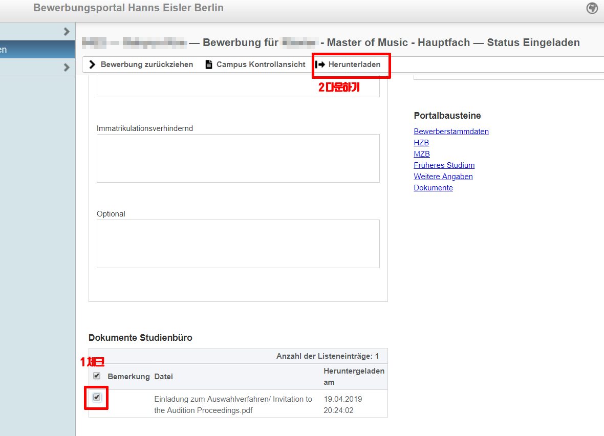 ### 주의사항!!!!! 화면 맨 위에 있는 >Bewerbung zurückziehen 은 절대 누르시면 안됩니다.